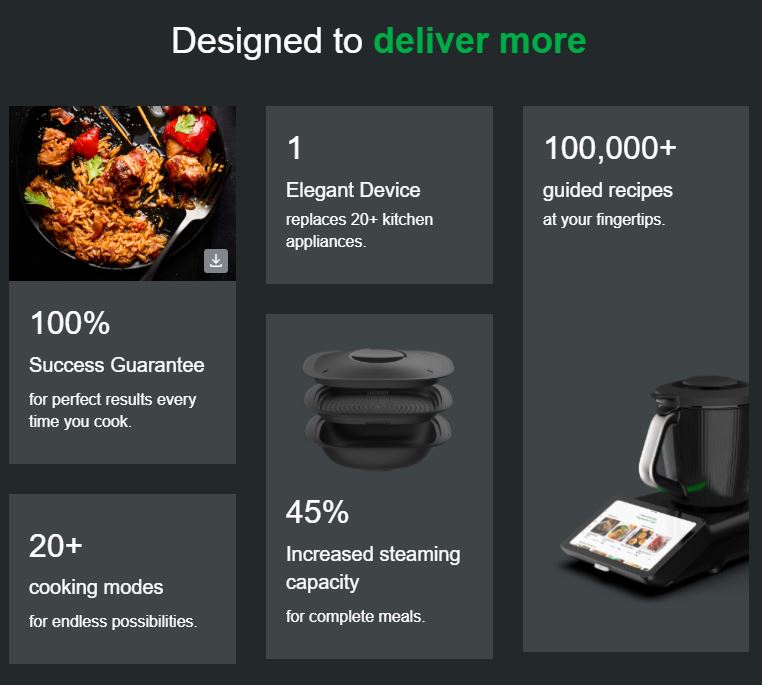 It chops, weighs, kneads, steams, stirs, cooks, grinds, mills, ferments, blends and so much more — all guided step by step on a large, easy-to-use touchscreen.